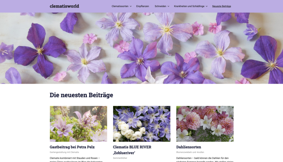 Brigitte Niemela ist Mitglied der International Clematis Society und veröffentlicht im International Journal und auf der Verbands-Webseite regelmäßig Beiträge zu Clematisthemen.