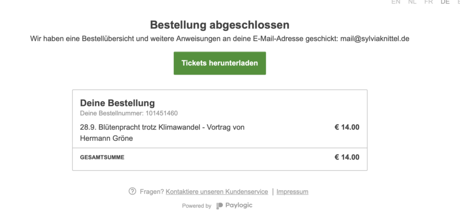 Wenn Du per Kreditkarte, Paypal oder Sofortüberweisung bezahlt hast: Du bekommst eine Bestätigung sofort online angezeigt. Hier kannst Du bereits auf Tickets herunterladen klicken und bekommst dann das Ticket mit den Links zum Vortrag und zum Video.
