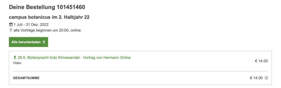 Auch wenn Du einen bereits vergangenen Vortrag nachschauen willst, buche den Vortrag bitte im Kursportal. Hier hast Du viel mehr Zeit für’s Nachschauen, nämlich 24 Monate.
