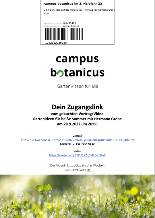 Im Ticket findest Du bereits den Zugangslink für den Zoom-Vortrag und den Link für das Video. Das Ticket kannst Du Dir abspeichern, aber wir erinnern Dich noch einmal am Vortragstag um 17:00 per Mail und wir senden Dir den Link zum Video nach wie vor im Nachhinein zu.