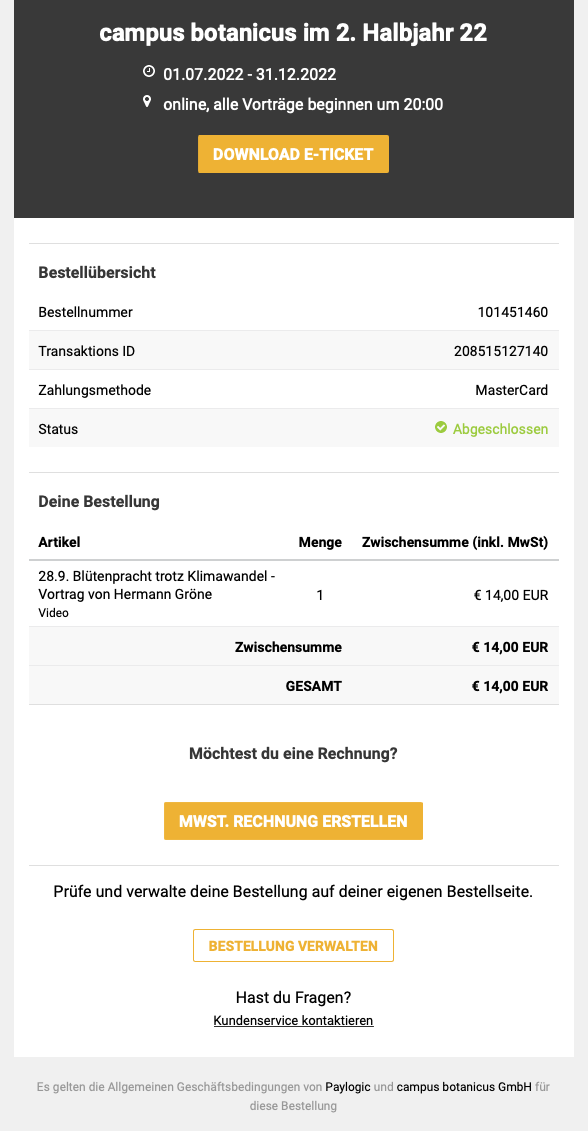 In der Mail befindet sich der Link zum Ticket für den Vortrag und zum Video, das Du Dir drei Wochen im Nachgang anschauen kannst.