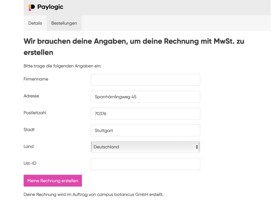 Die Rechnung kannst Du Dir selbst erstellen. In der Mail ist ein Button mit der Aufschrift „MwSt Rechnung erstellen“, siehe Screenshot oben. Du kommst dann auf die Seite aus dem Screenshot unten. Hier kannst Du die Firmenangaben hinzufügen. Danach wird eine Rechnung entsprechend erstellt und Dir per Mail zum Download bereitgestellt.