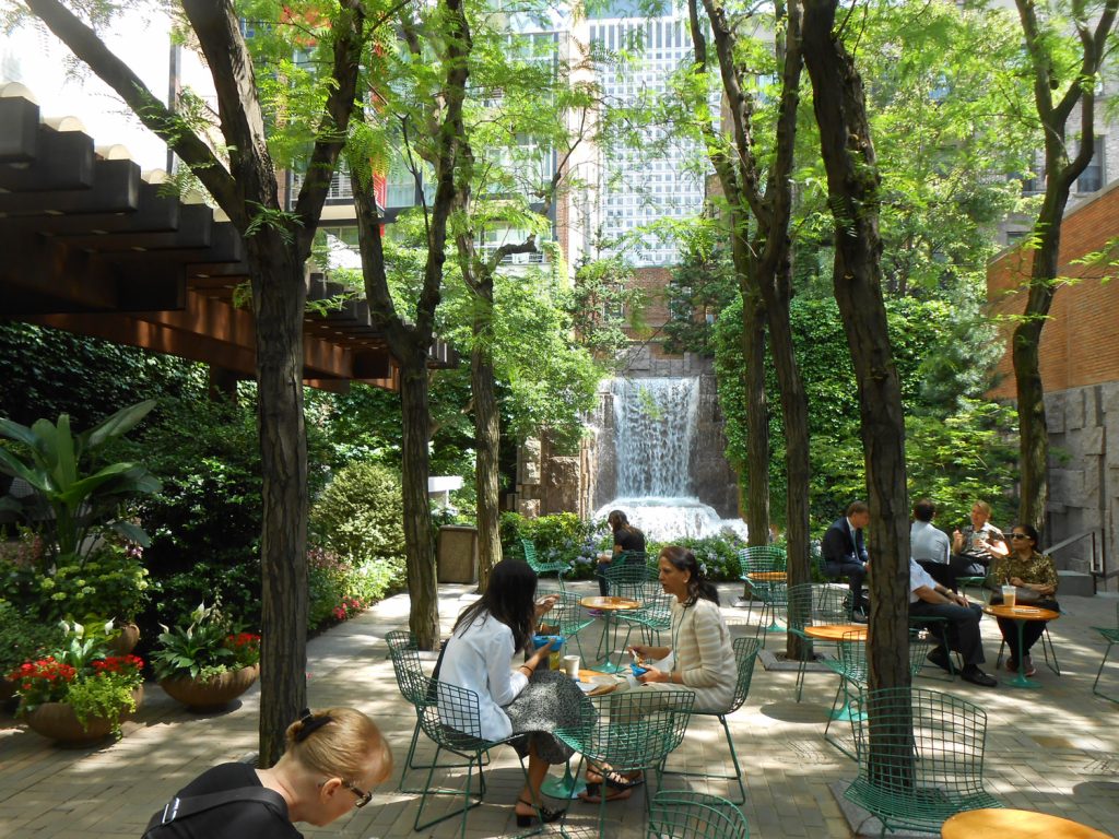 Wenn auch Manhattan der Inbegriff von Stadt ist, so gibt es dort viele grüne Oasen, die z.B. in den Mittagspausen intensiv genutzt werden. Der Skulpturen-Innenhof des MOMA (Museum of Modern Art) gehört dazu, ebenso die Dachgärten des Trump Towers und an der Wallstreet.