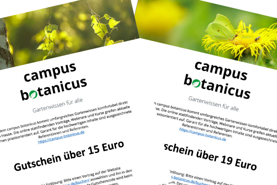 Wenn Du jemandem einen Gutschein für einen Vortrag des campus botanicus verschenken willst, dann kannst Du diesen jetzt buchen. Es gibt Gutscheine im Wert von 19 Euro und im Wert von 15 Euro – also entsprechend unseren am häufigsten verwendeten Vortragspreisen. Die Wertgutscheine lassen sich für alle Live-Vorträge in unserem Buchungstool auf unserer Website einsetzen, der entsprechende Wert wird dann von der Endsumme angezogen. (Achtung: Sie gelten nicht für unsere Kursplattform, bitte dafür den Gutschein dort buchen.)