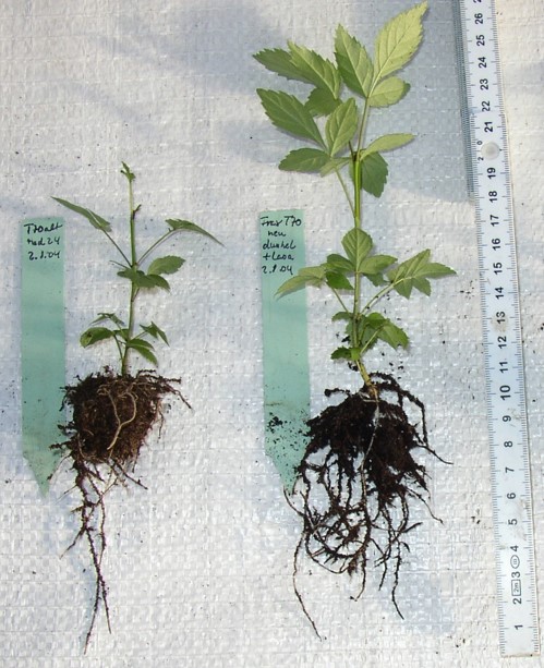 Carolin Schneiders Firma Inoq produziert Mykorrhiza und hat viel damit experimentiert. Hier kannst Du sehen, wie deutlich stärker ein Esche wächst, wenn sie in Symbiose mit Wurzelpilzen lebt. Links ohne, rechts mit.