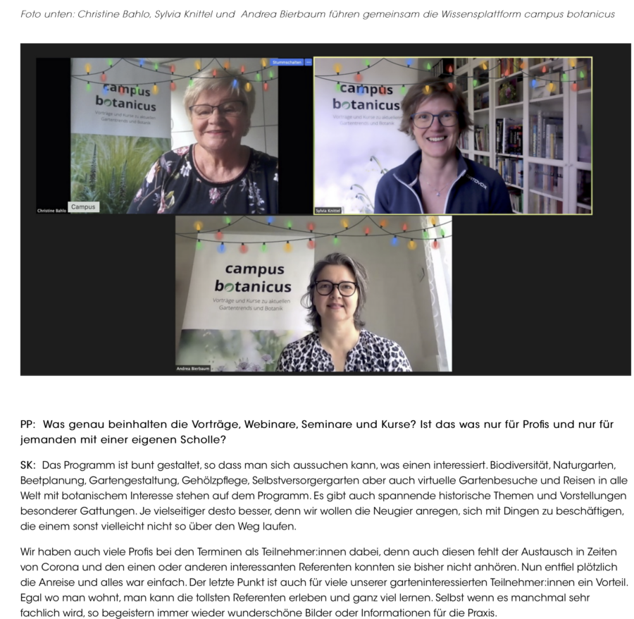 Angefangen hat alles im Mai 2020, als wir uns mit zwei weiteren Garten-Frauen zusammengetan haben, um während der Corona-Zeit die gepflegte Kultur der Gartengespräche mit Vorträgen, Seminaren und Begegnungen aufrecht zu erhalten. Auf Initiative von Christine Bahlo, Organisatorin der Weinheimer Gartengespräche, haben wir die Idee einer virtuellen Durchführung weitergesponnen. Sehr schnell ist viel mehr daraus geworden, weil das Interesse enorm war.