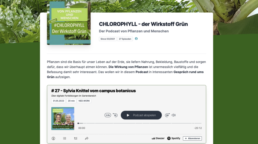 Sylvia war zu Gast bei Claudia Goelz im Chlorophyll-Podcast. Für ihren Podcast lädt Claudia Menschen ein, die mit dem „Wirkstoff Grün“ zu tun haben. Wir sprechen über Garten, Fotografie und natürlich den campus botanicus. Danke an Claudia, dass ich dabei sein durfte!
